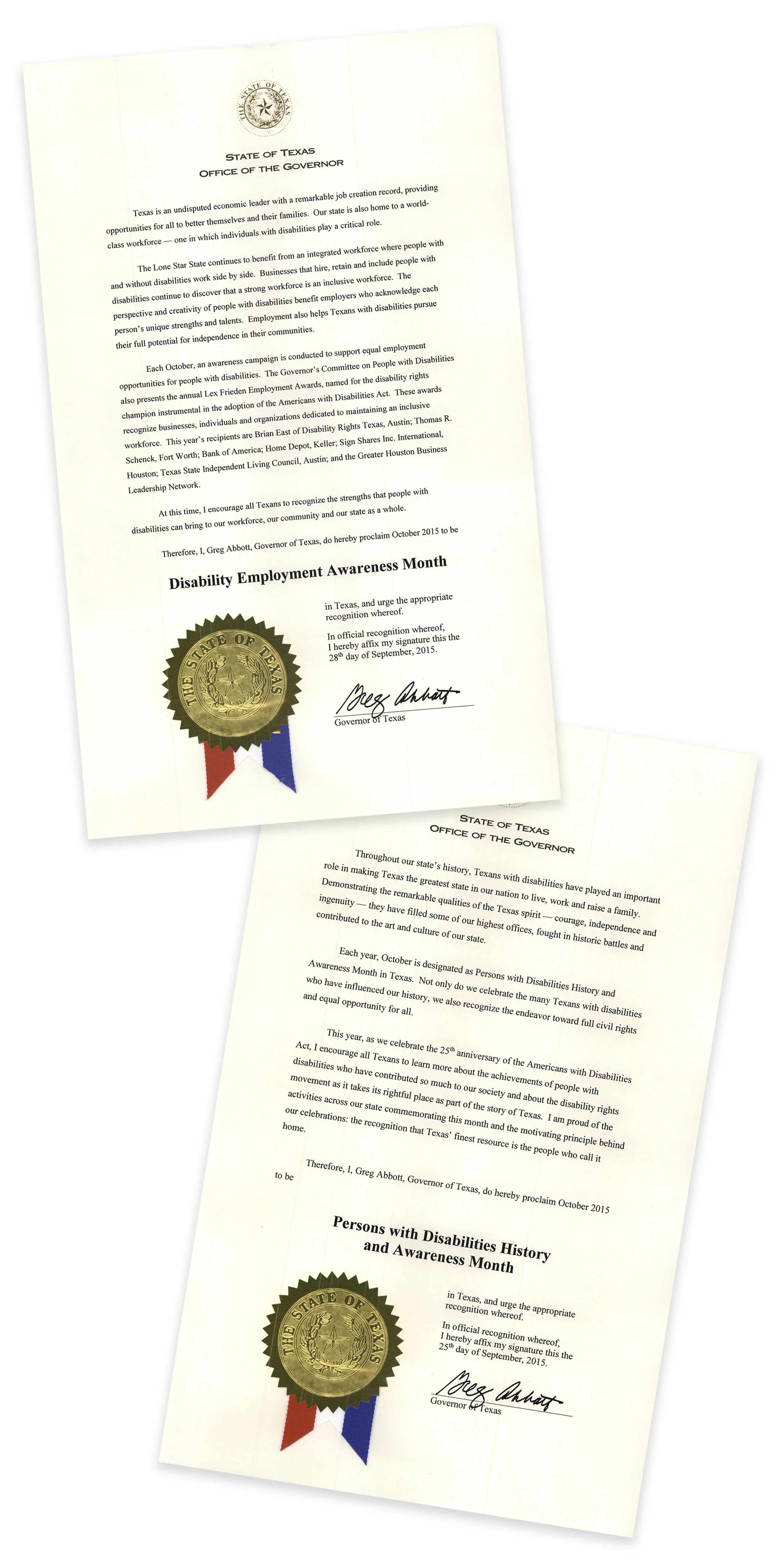 State of Texas Office of Governor Greg Abbott has issued two important proclamations regarding the employment of people with disabilities. Full transcripts of the proclamations are below.