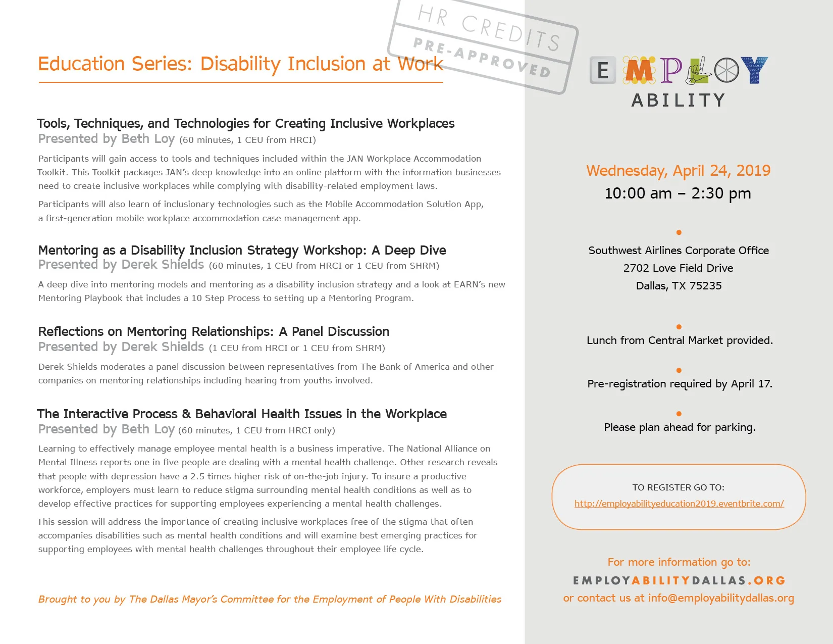 A facilitated discussion regarding the research findings and how employers can adopt policies and practices to enable talent acquisition, on-boarding and development to capture, retain and advance a more disability-inclusive workforce. The discussion will revolve around moving the model of effective strategies that have worked to date further, creating Inclusion@Work 3.0. Themes to be included: automation’s impact, moving beyond entry level, and recent trends from around the country… employee resource groups, Autism@Work, Spectrum Designs, customized integrated employment, and more.